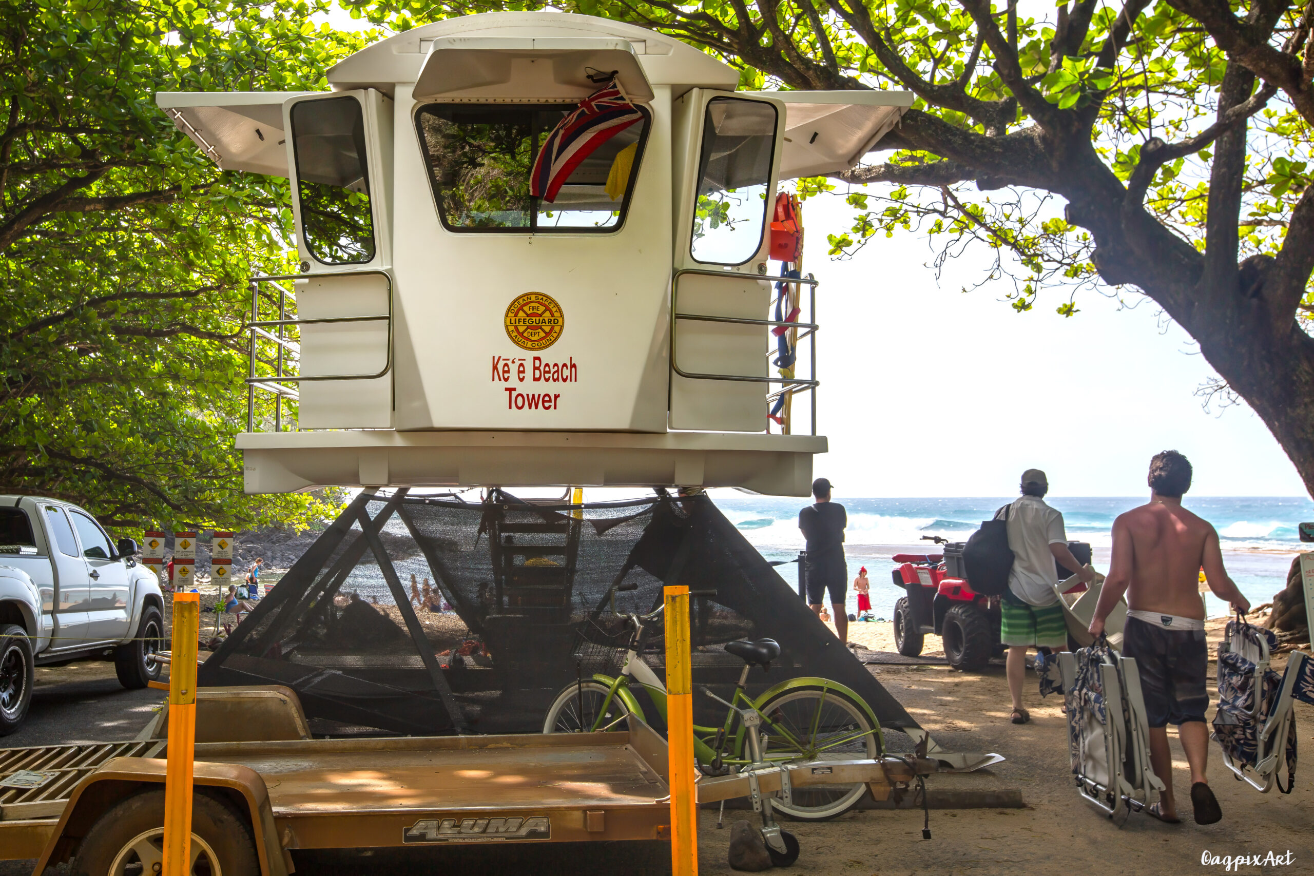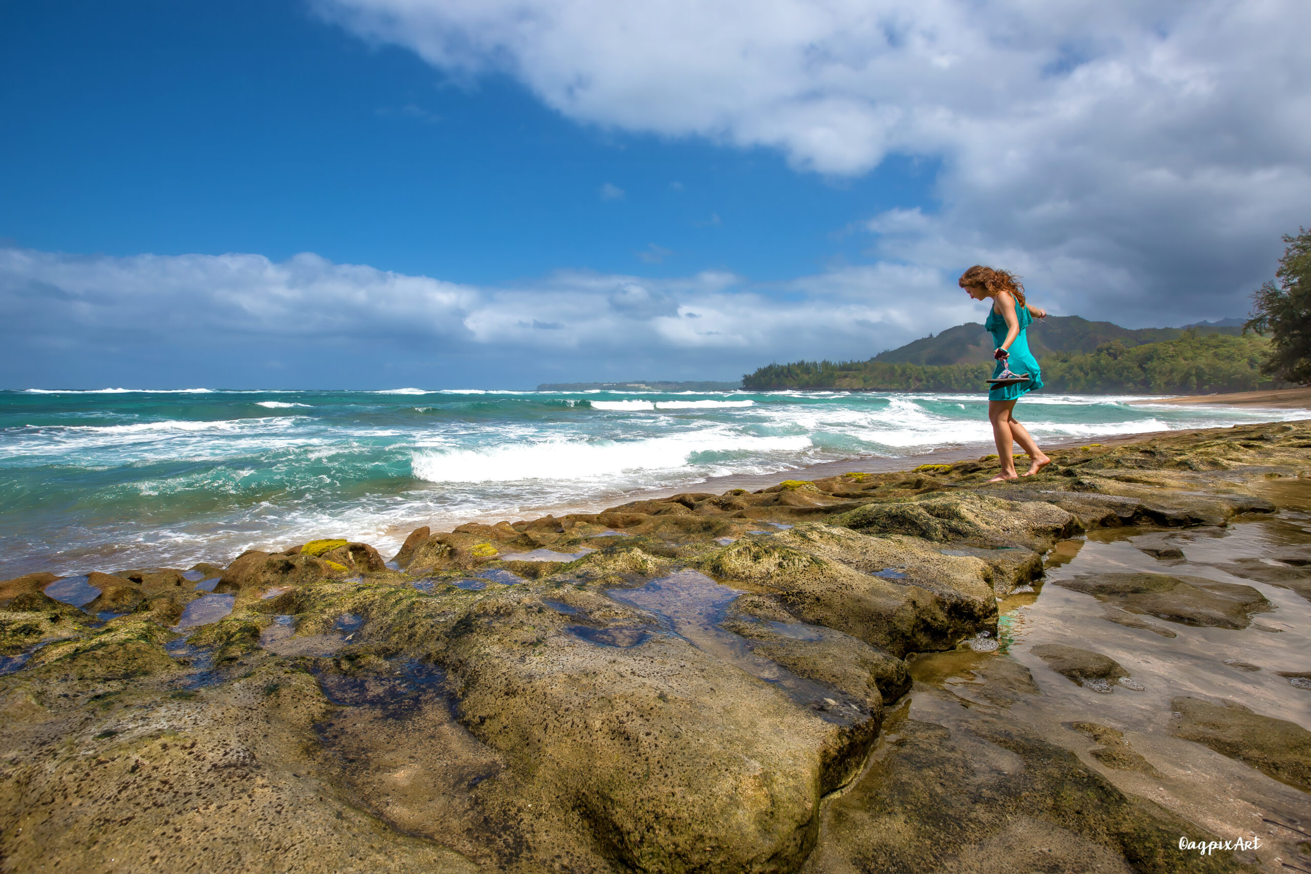 One of Kauai’s most iconic and photogenic stretches of sand on the North Shore—just a quick 2-3 mile drive west from Hanalei along Route 560. It is a curve of white sand nestled at the base of a dark lava cliff, with a giant lava rock jutting out of the turquoise sea just offshore. Keep in mind that the trek down from the road may take you through slippery mud. Rough sand for walking. No Lifeguard. Swimming can be very dangerous.