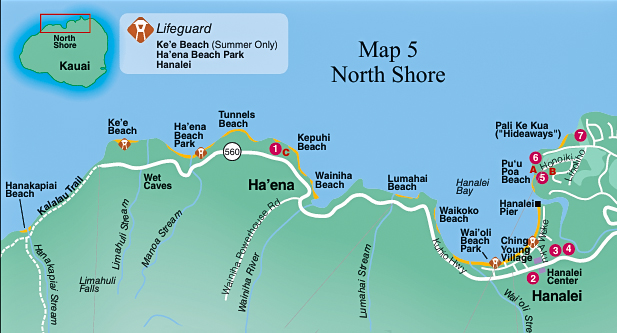 Past Tunnels is Ha‘ena Beach Park, a lovely golden sand beach. The reefs bordering both sides of the beach, named ‘Maniniholo’ after striped convict fish, can provide summertime snorkeling, swimming and rafting. During winter months, large waves can break right onto the beach, making swimming, even standing, hazardous. Restrooms, showers, picnic and barbecue facilities; camping by permit. Lifeguard. Parking limited but possible.