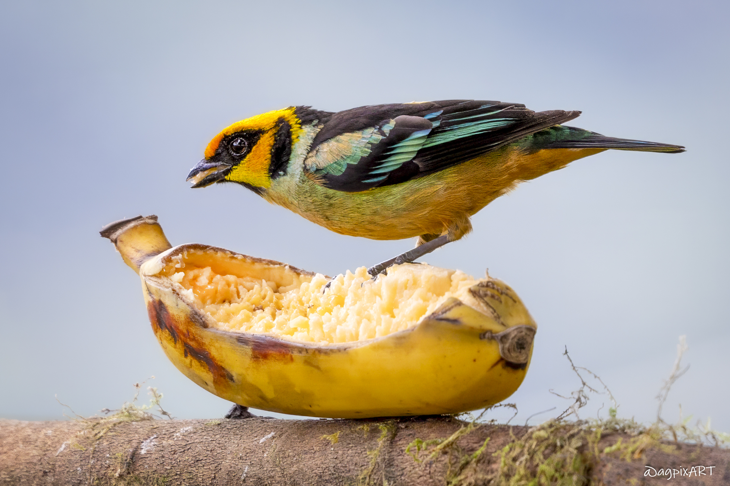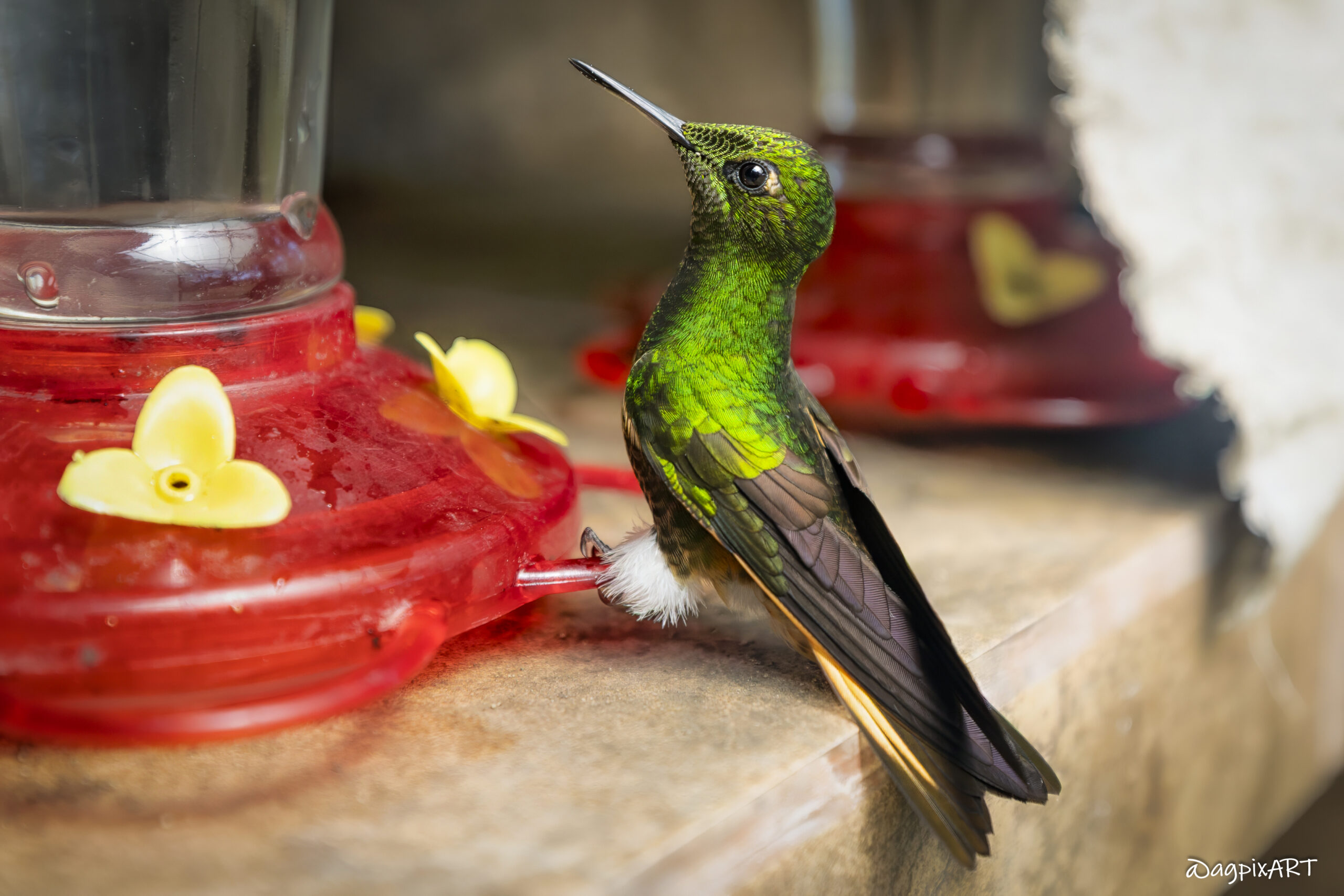Relax at feeding stations where dozens of hummingbirds (e.g., Booted Racket-tail, Violet-tailed Sylph) and colorful tanagers (e.g., Flame-faced, Golden) dart around.
