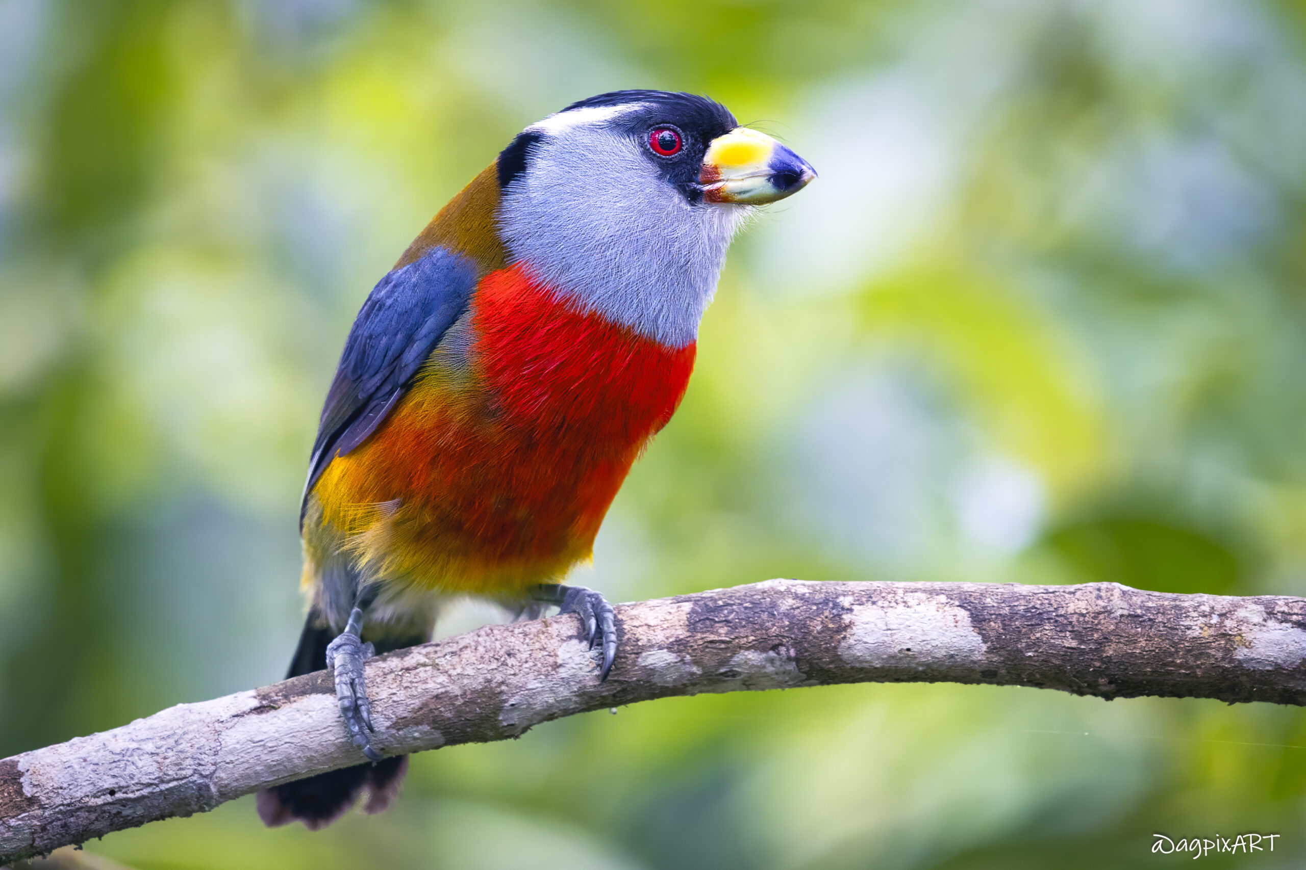 The Toucan Barbet (Semnornis ramphastinus) is a spectacular and iconic bird in the cloud forests. This striking bird dazzles with its gray throat, vivid red breast and belly, bold black cap, and a distinctive white stripe trailing behind its eye, complemented by a stout yellow bill tipped in black. A versatile feeder, it eats large insects and fruit, often gracing feeders with its presence. Its signature song—a duet of nasal toots performed by males and females at slightly varied pitches and rhythms, occasionally overlapping—creates a haunting, harmonious sound.