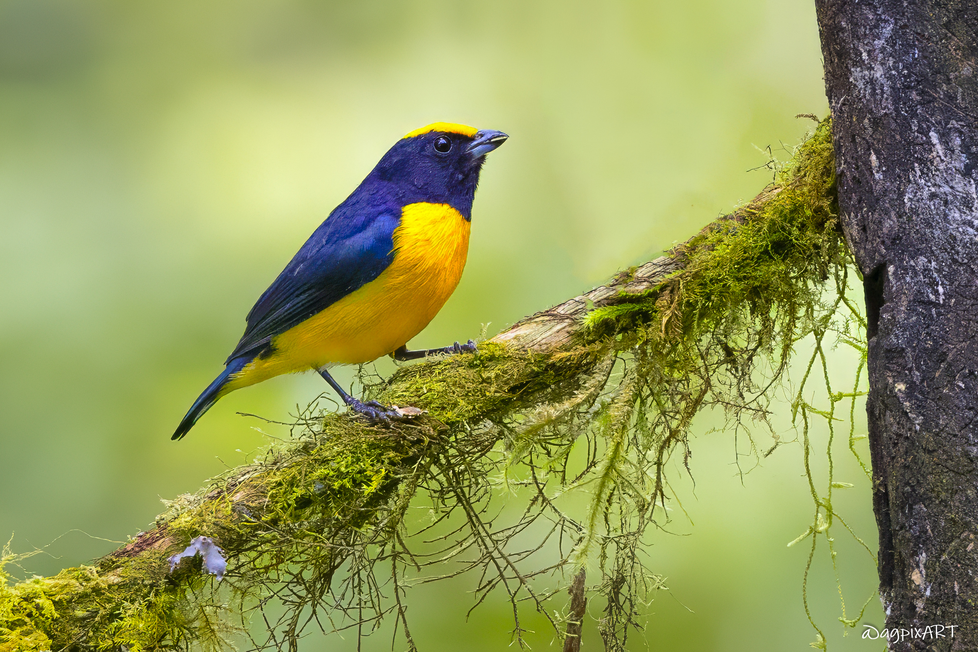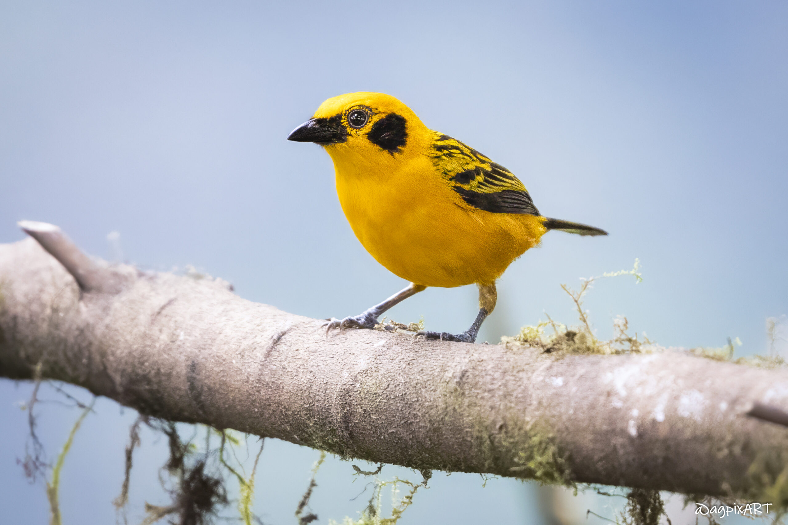 The Golden Tanager (Tangara arthus) is a radiant tanager found in foothills and subtropical forests, spanning Venezuela to Bolivia. This petite tanager dazzles with its vibrant golden-yellow plumage, accented by a distinct black ear patch, a subtly streaked back, and predominantly black wings and tail. Northern populations flaunt a rich chestnut breast band and flanks, adding regional flair. Both sexes shimmer alike, though juveniles sport a softer, muted yellow. One of the most common tanagers in the misty cloud forests.