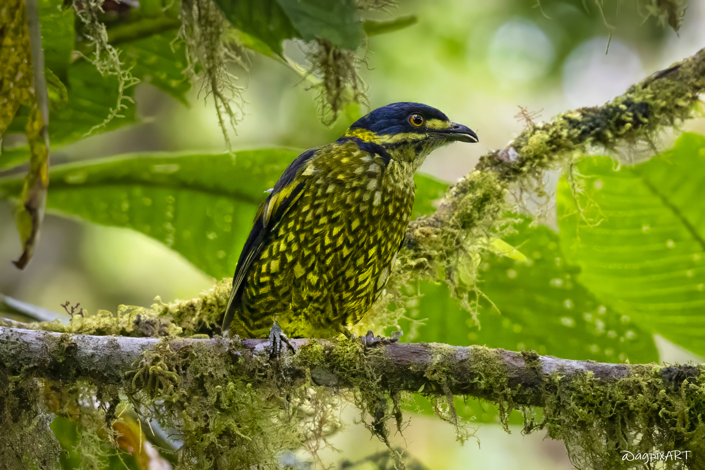 The Scaled Fruiteater (Ampelioides tschudii) is a captivating, compact bird of the Andean forests, sporting a distinctive mossy green and black, scaly pattern. Its chunky build, short tail, and flat head are accented by a bold green wingbar and a striking black cap. Females display subtler black hues but retain the iconic scaly texture. Quiet and elusive, it perches discreetly in mid-to-upper forest levels, often near fruiting trees. Its presence is betrayed by a loud, descending whistle that pierces the misty air, a signature call of its high-altitude haunts.