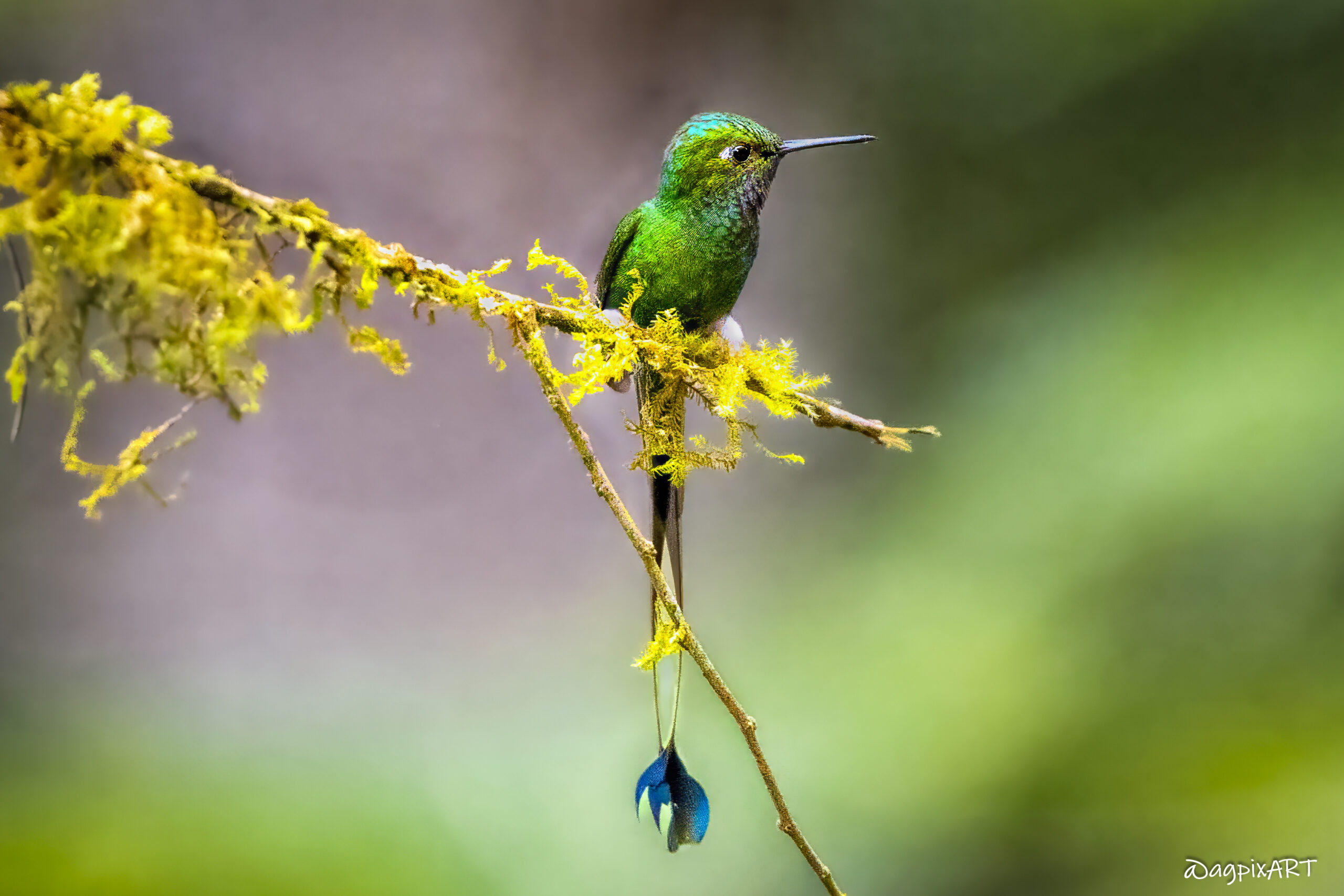 The White-booted Racket-tail (Ocreatus underwoodii) is an enchanting hummingbird, known for its whimsical charm. The male, tiny yet striking, sports an elongated tail adorned with distinctive racket-shaped tips and fluffy white leg puffs, making him easy to recognize. The female, lacking the male’s dramatic tail and rackets, is identified by her pristine white breast, delicate whisker mark, and a subtle white spot (not a line) behind the eye. Compared to the similar female Purple-bibbed Whitetip, she has a shorter bill and clearer breast.