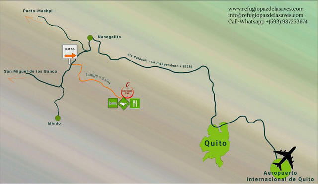 Refugio Paz de las Aves is located in the Mindo-Nambillo Cloud Forest, near Nanegalito, about 20 km (12 miles) from Mindo’s town center, in Ecuador’s Pichincha Province. It’s roughly a 30–45-minute drive from Mindo or 2 hours from Quito’s Mariscal Sucre International Airport via Route E28. It spans ~120 hectares, protecting primary cloud forest and reforesting degraded areas.